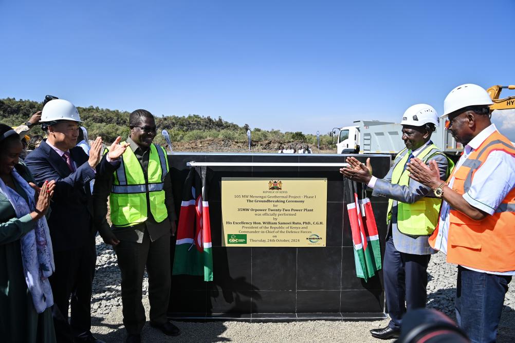 2024年10月24日,在肯尼亚纳库鲁郡,肯尼亚总统威廉·鲁托(右二)出席梅嫩加伊地热开发项目一期Orpower 22地热电站开工仪式。新华社记者 韩旭 摄