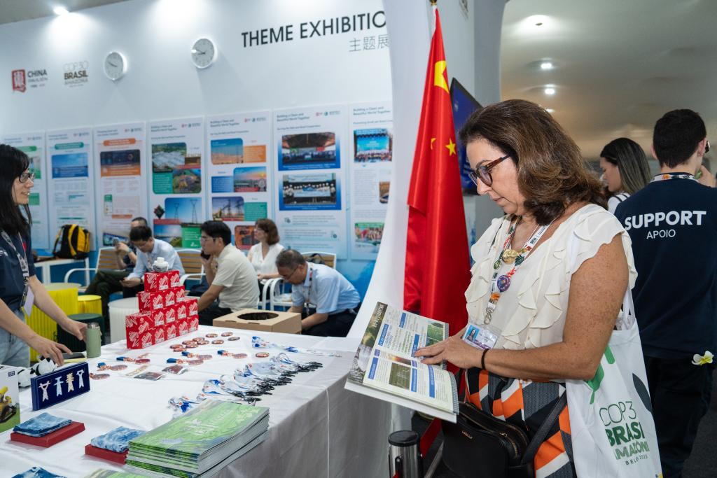 2025年11月12日,在巴西贝伦,嘉宾在COP30会场内的“中国角”阅读展示资料。新华社记者 王天聪 摄