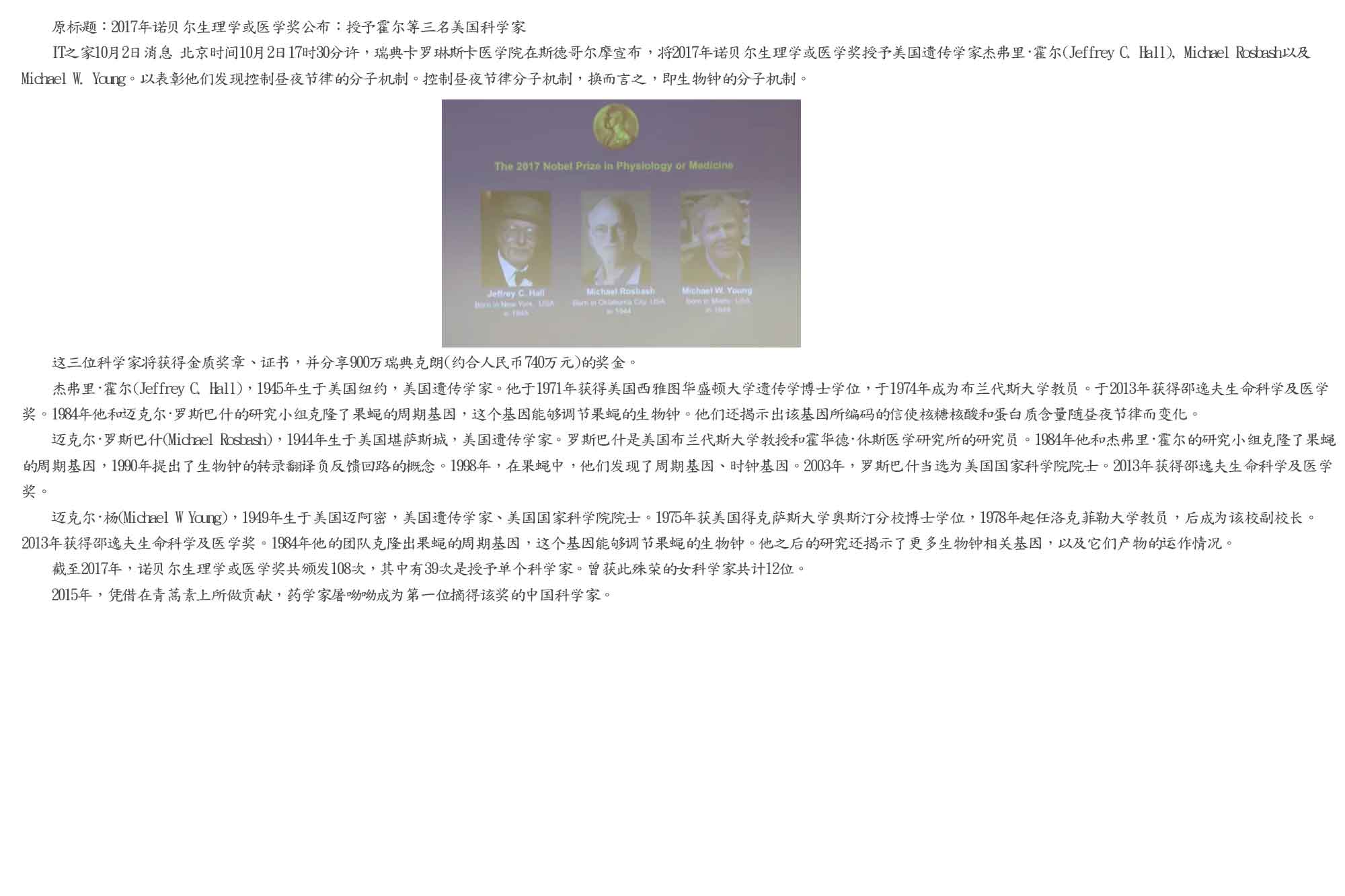 生理学或医学奖授予美国科学家杰弗里·霍尔、迈克尔·罗斯巴什和迈克尔·扬,以表彰3人在研究生物钟运行的分子机制方面的成就。
