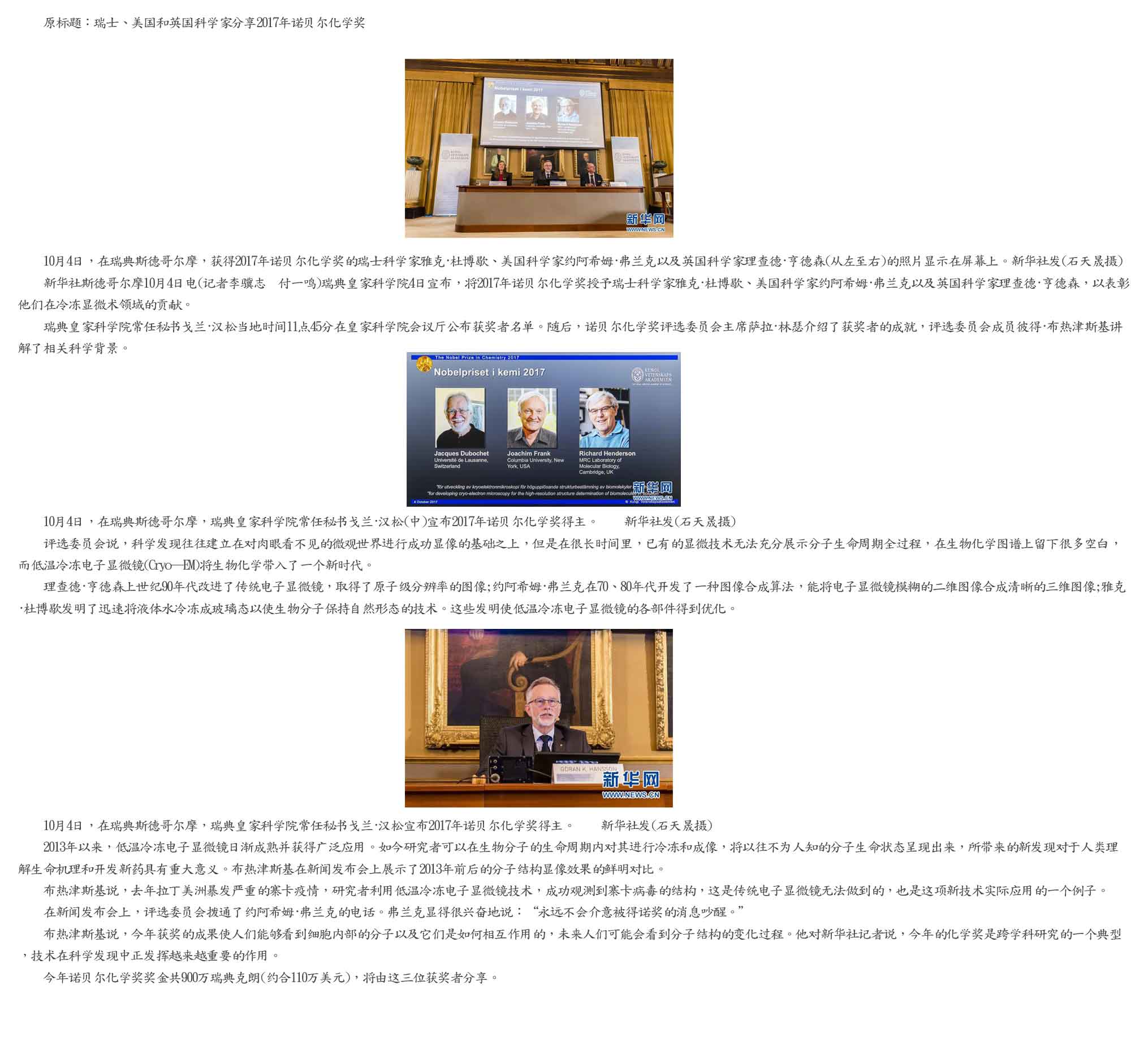 化学奖授予瑞士科学家雅克·杜博歇、美国科学家约阿希姆·弗兰克以及英国科学家理查德·亨德森,以表彰他们在冷冻显微术领域的贡献。