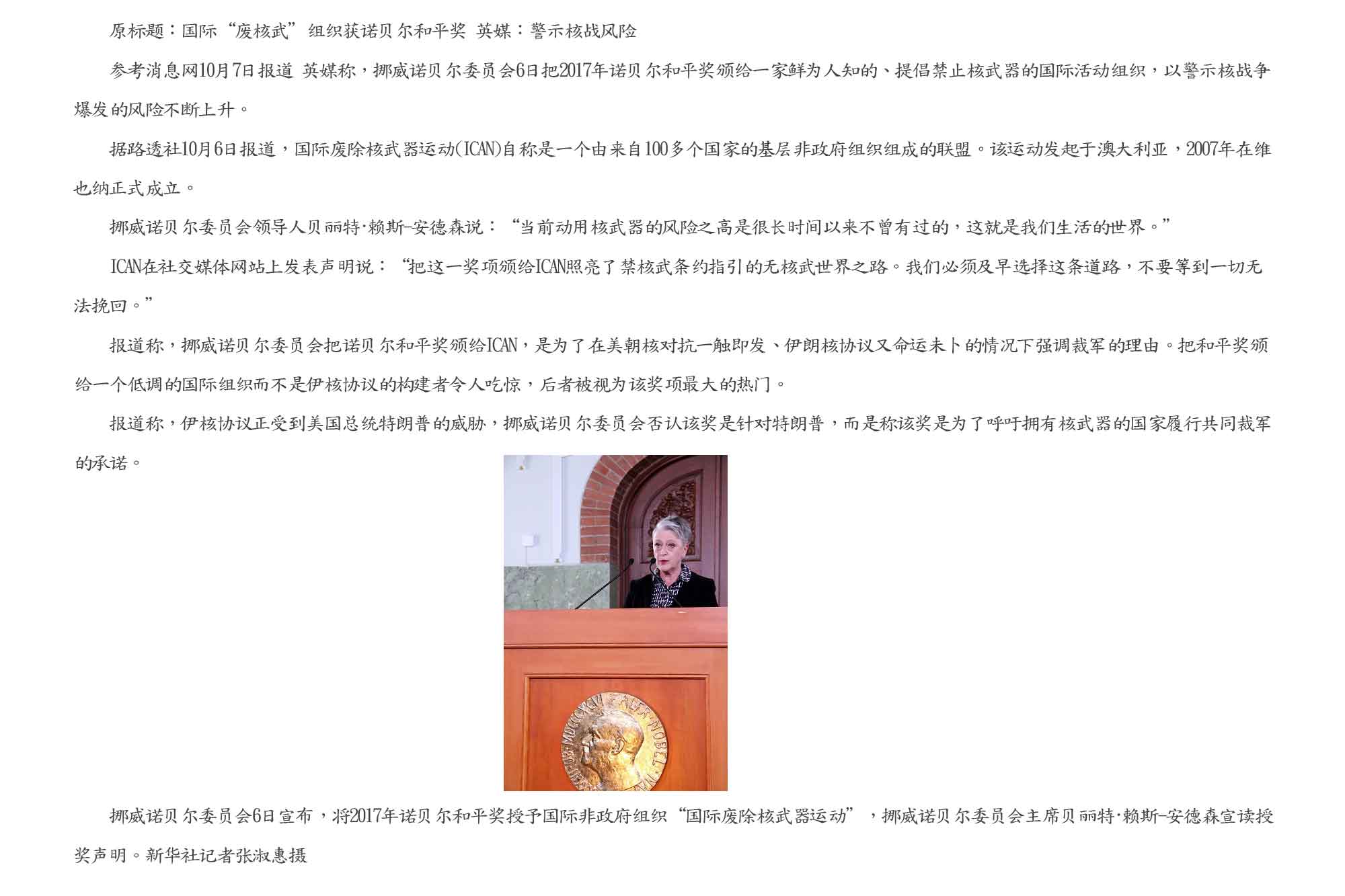 和平奖授予国际非政府组织“国际废除核武器运动”。