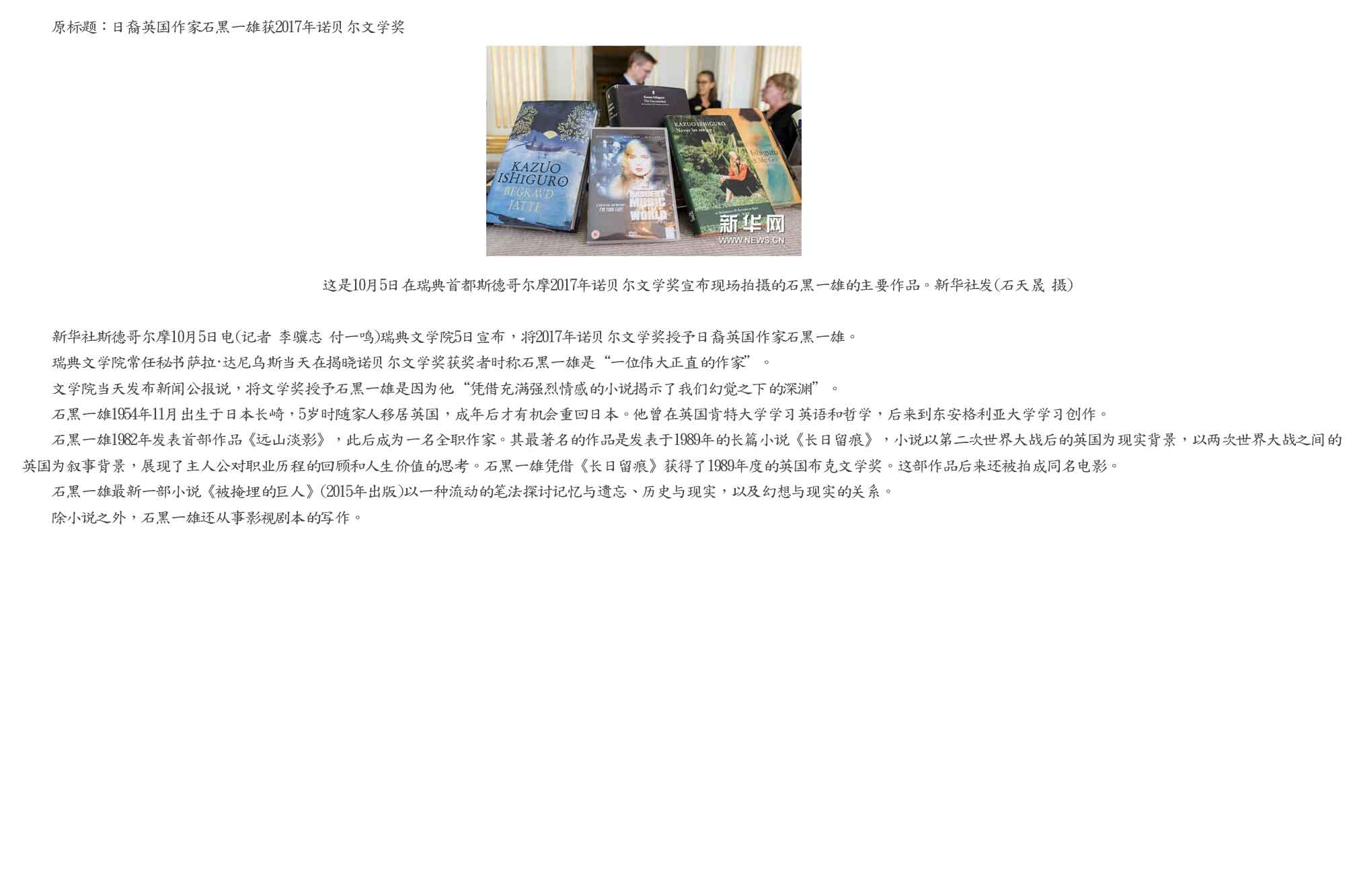 文学奖授予日裔英国作家石黑一雄。