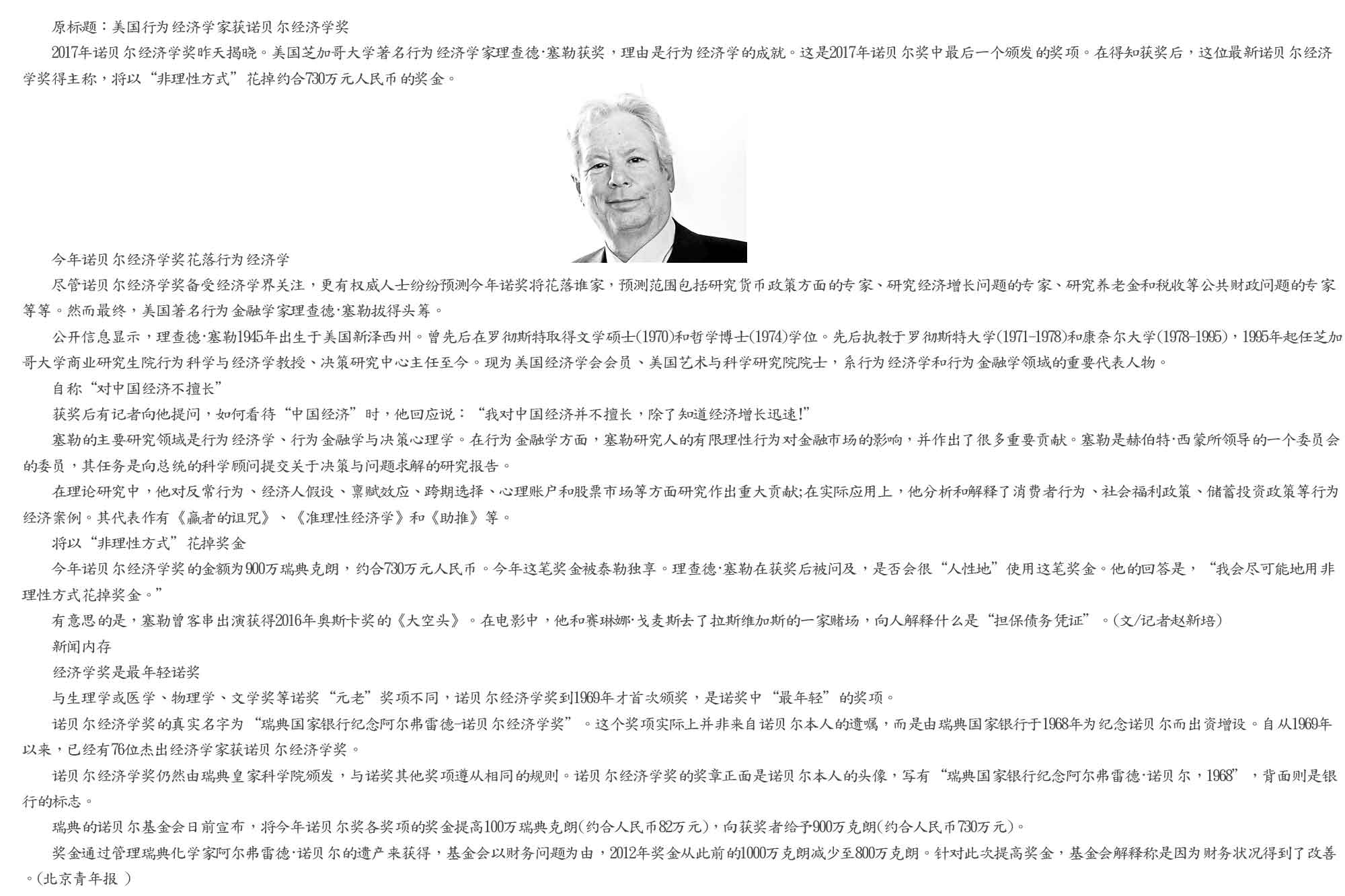 经济学奖授予美国经济学家理查德·泰勒,表彰其在行为经济学领域的贡献。