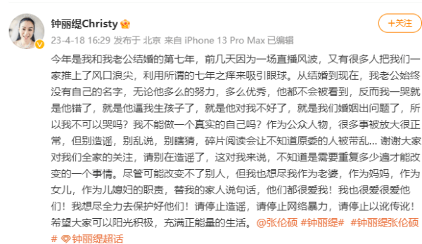 今年是我和我老公结婚的第七年,前几天因为一场直播风波,又有很多人把我们一家推上了风口浪尖,利用所谓的七年之痒来吸引眼球。从结婚到现在,我老公始终没有自己的名字,无论他多么的努力,多么优秀,他都不会被看到,反而我一哭就是他错了,就是他逼我生孩子了,就是他对我不好了,就是我们婚姻出问题了,所以我不可以哭吗?我不能做一个真实的自己吗?作为公众人物,很多事被放大很正常,但别造谣,别乱说,别瞎猜,碎片阅读会让不知道原委的人被带乱… 谢谢大家对我们全家的关注,请别在造谣了,这对我来说,不知道是需要重复多少遍才能改变的一个事情。尽管可能改变不了别人,但我也想尽我作为老婆,作为妈妈,作为女儿,作为儿媳妇的职责,替我的家人说句话,他们都很爱我!我也很爱很爱他们!我想尽全力去保护好他们!请停止造谣,请停止网络暴力,请停止以讹传讹!希望大家可以阳光积极,充满正能量的生活。