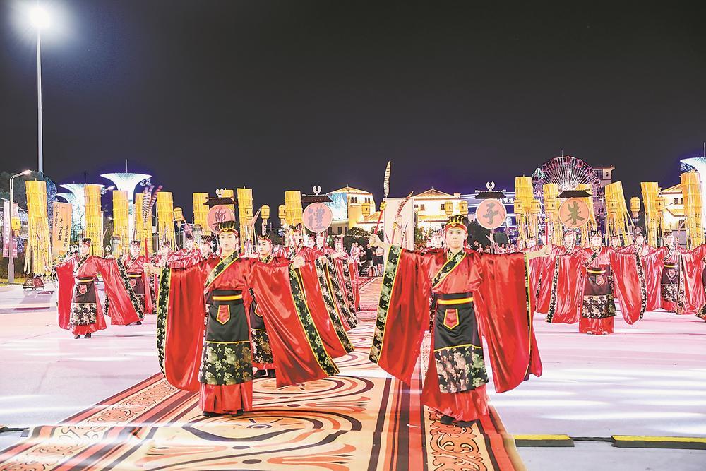 国庆中秋假期,以朱熹的人生轨迹和思想脉络为主线的大型文旅山水史诗《月映武夷》开演前,演员们在月映武夷剧场前的武夷山市武夷广场上,为游客奉上朱子礼乐大典表演。朱子礼乐大典于今年8月底启幕,通过广场秀的形式,将朱子文化变得可触可感、可亲可近。李茜 摄