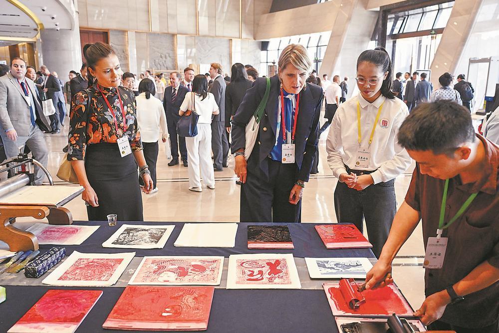 参加18日大会的外国嘉宾在会场外参观松溪版画制作。福建日报记者 王毅 摄