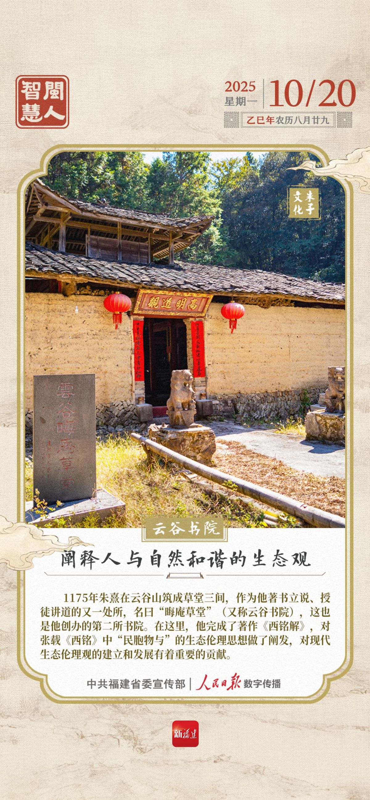1175年朱熹在云谷山筑成草堂三间,作为他著书立说、授徒讲道的又一处所,名曰“晦庵草堂”(又称云谷书院),这也是他创办的第二所书院。在这里,他完成了著作《西铭解》,对张载《西铭》中“民胞物与”的生态伦理思想做了阐发,对现代生态伦理观的建立和发展有着重要的贡献。