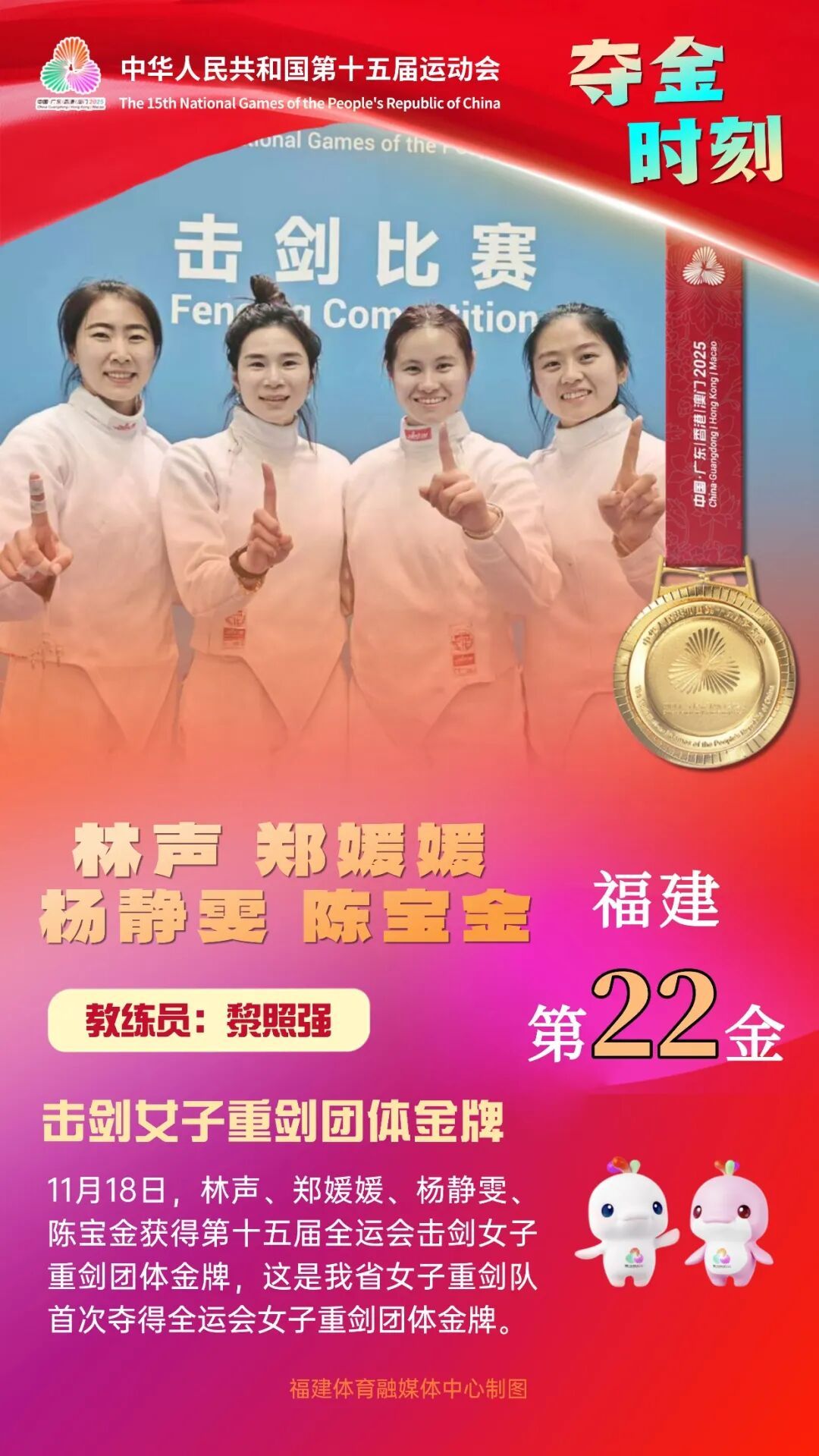 欣闻我省运动员林声、郑媛媛、杨静雯、陈宝金在第十五届全国运动会击剑女子重剑团体项目比赛中,团结协作,勇夺金牌。在此,省委、省政府向你们及林声、郑媛媛、杨静雯、陈宝金同志表示最热烈的祝贺,向我省全体运动员、教练员和工作人员表示亲切的慰问!希望我省参赛运动员向林声、郑媛媛、杨静雯、陈宝金同志学习,发扬敢为人先、爱拼会赢的开拓创新精神,团结一心,奋勇争先,在本届全运会上夺取更加优异的成绩!