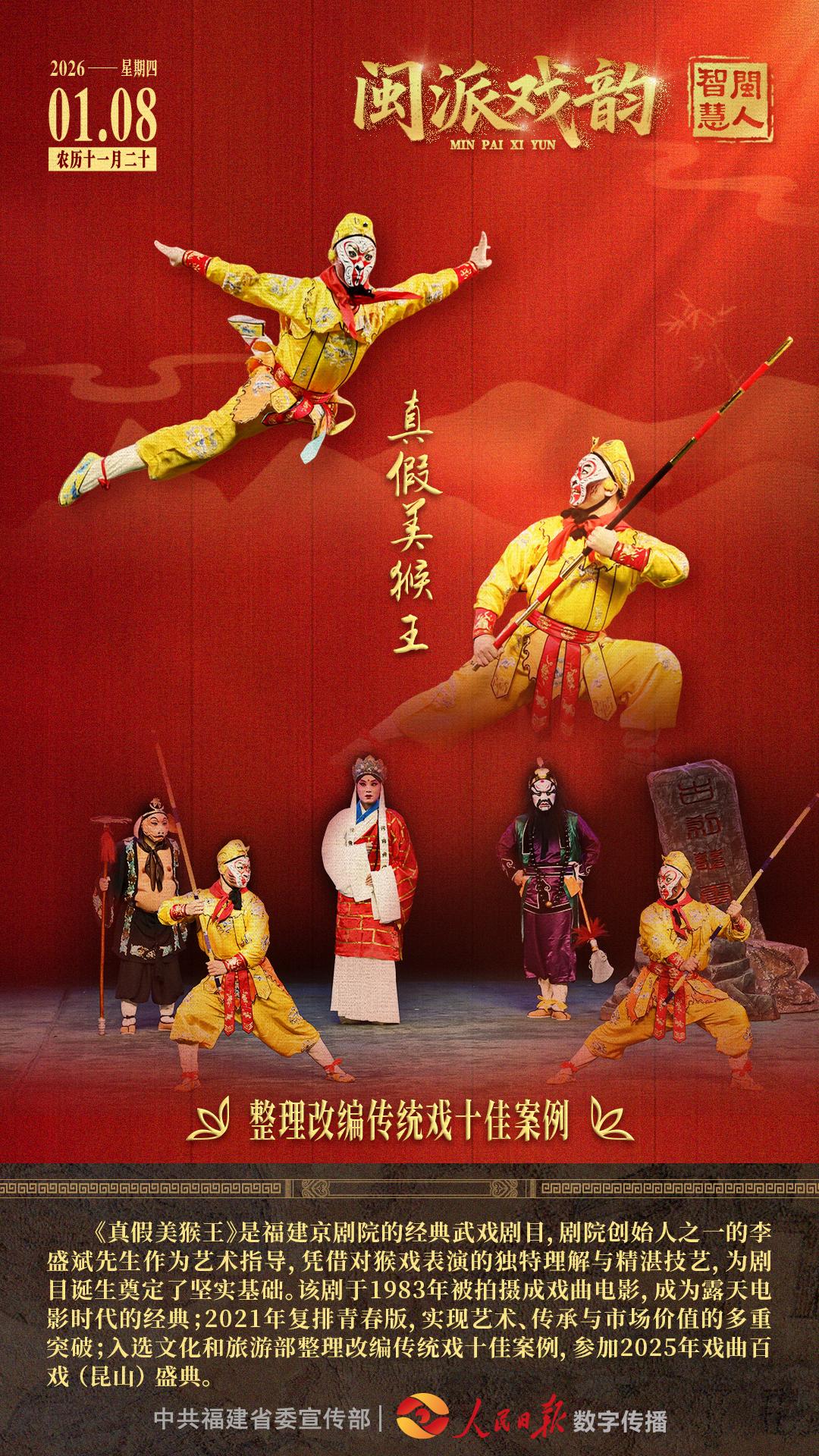 《真假美猴王》是福建京剧院的经典武戏剧目,剧院创始人之一的李盛斌先生作为艺术指导,凭借对猴戏表演的独特理解与精湛技艺,为剧目诞生奠定了坚实基础。该剧于1983年被拍摄成戏曲电影,成为露天电影时代的经典;2021年复排青春版,实现艺术、传承与市场价值的多重突破;入选文化和旅游部整理改编传统戏十佳案例,参加2025年戏曲百戏(昆山)盛典。
