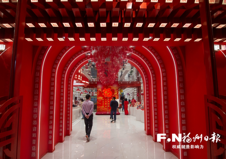 福书轩分为上下两层,面积近1000平方米,围绕“福·初心”“福·榜样”“福·文化”“福·典藏”“福·时尚”五个主题进行展陈。甫入福书轩,先穿过入口处的“百福门”,随后就是被称为“幸福大道”的福墙走道,每穿过一道拱门都能看到一个全新的“福”文化标语。