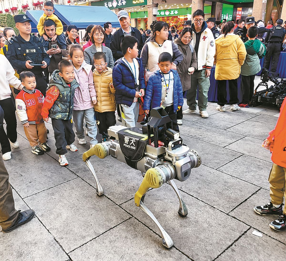10日下午,厦门市公安局在厦门中山路步行街举办警营开放日活动。图为侦查机器狗与市民互动。 记者 傅韬旭 摄