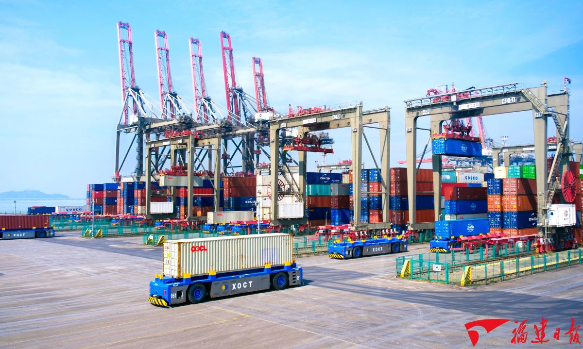 福建港口能级跃升,可常态化停靠世界最大的散货船、集装箱船、邮轮等船型。图为2023年5月25日拍摄的全国首个5G全场景应用智慧港口厦门远海码头。施辰静 摄