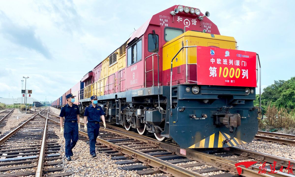 福建把稳外贸作为稳增长稳就业的重要抓手,2024年进出口规模近2万亿元,提前超额完成“十四五”目标。图为2021年6月2日,中欧班列(厦门)累计发运的第1000列班列从厦门自贸片区海沧园区驶向德国汉堡。施辰静 摄