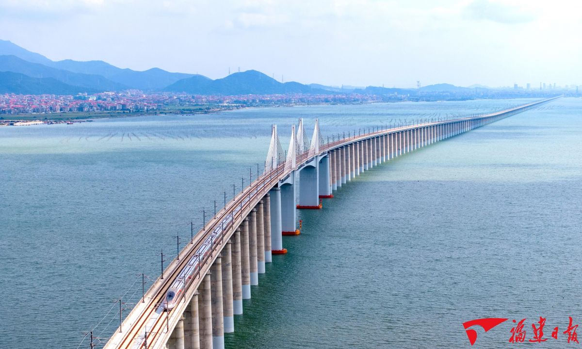 福建高速公路、铁路水平全国领先。图为2023年9月28日,高铁列车行驶过湄洲湾跨海大桥,我国首条设计时速350公里的跨海高铁——福厦高铁正式开通运营。陈斌 摄