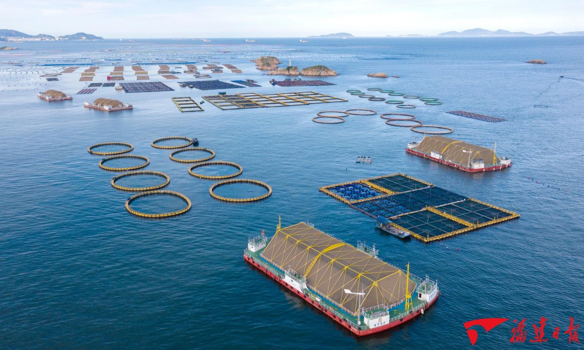 福建大力发展深远海养殖渔场,深远海养殖总体规模全国第一,“海洋牧场”成果斐然。图为2023年6月17日拍摄的连江县定海湾,海面上漂浮着11台套深远海养殖平台。王毅 摄