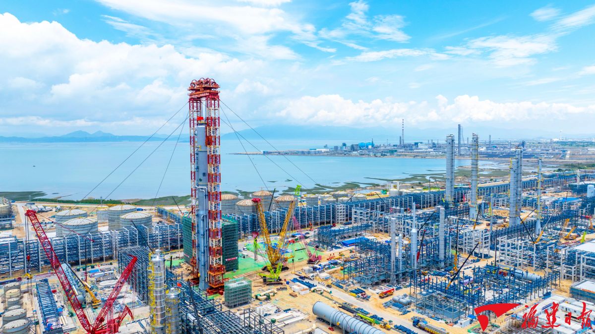 中沙古雷乙烯项目和古雷炼化一体化工程二期项目相继开工建设,先后打破福建外商投资项目和单体工业项目投资额纪录。图为2025年5月16日,全球最大EOEG洗涤塔在中沙古雷乙烯项目工地成功吊装。沈昊鹏 摄