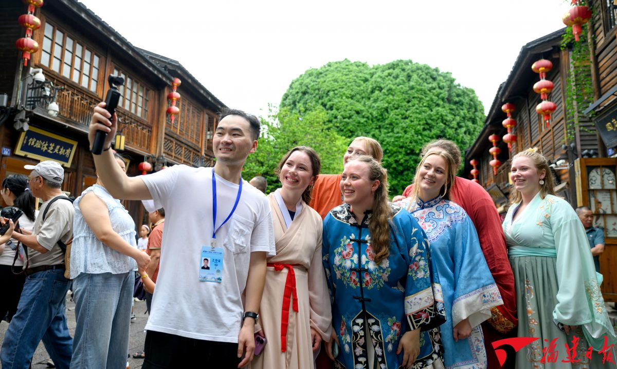 “十四五”期间,福建故事、中国声音在世界舞台精彩绽放。图为2025年7月12日,参加“鼓岭缘”中美青少年合唱周的美国青少年在三坊七巷身穿汉服留影。施辰静 摄