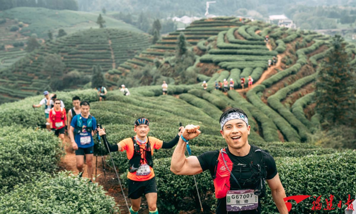 福建“三茶”统筹发展成效显著,茶叶单产水平、茶树良种覆盖率、涉茶国家级农业产业化龙头企业数量领先全国。图为2025年11月9日,跑者们穿行于生态优良的武夷茶山之间。施辰静 摄