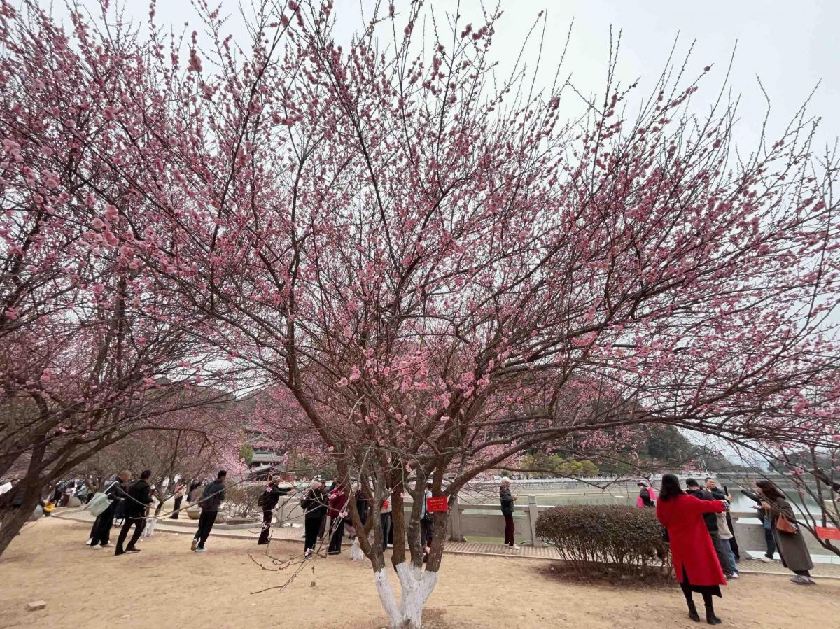 盛开的梅花吸引了众多游客前来打卡。