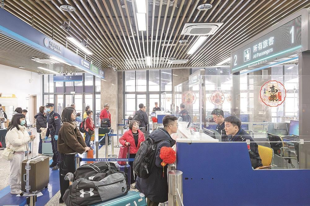 2月14日,福州边检站民警在为台胞办理手续。他们还组建了“乡音伴行小分队”,用闽南语、福州话与台胞亲切交流,让通关体验更具温情。 福建日报记者 王毅 摄
