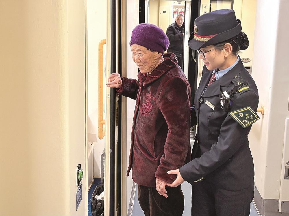 近日,在厦门北开往兰州的列车上,列车长扶老年旅客去洗手间。春运期间,福州客运段厦渝车队推出一系列“银发服务”专项举措,用精细化、有温度的服务,护航老年旅客平安温馨出行。福建日报通讯员 邱鹏原 摄