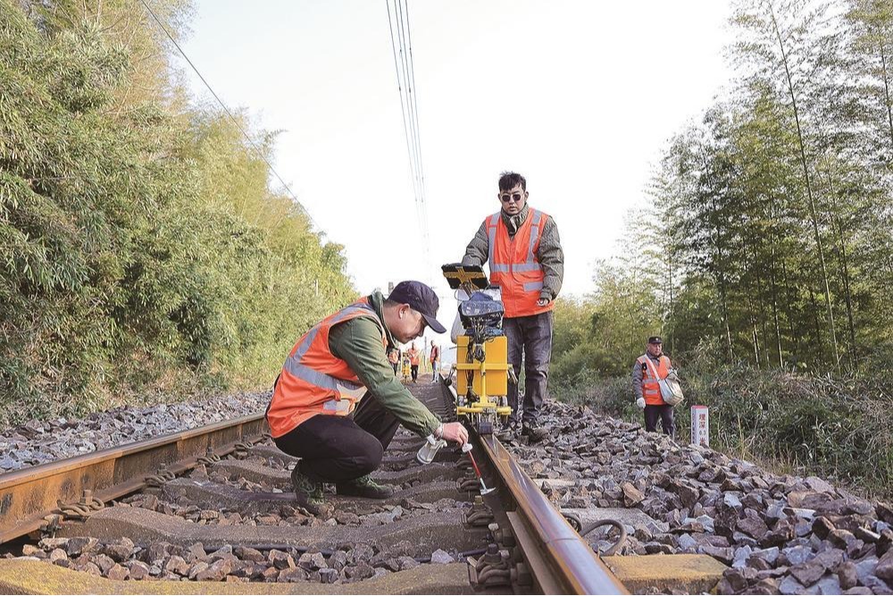 近日,中国铁路南昌局集团有限公司南平工务段的探伤工们坚守在峰福铁路线上,对钢轨及焊缝进行细致检测,确保列车运行安全。这些橙色身影在寒风中步行数公里,日均行走超2万步,用责任与专业守护着万千旅客的归途安全,被称为钢轨的“守护神”和“B超师”。图为探伤工在钢轨伤损处打上标记。福建日报记者 张颖 通讯员 吴志祥 摄
