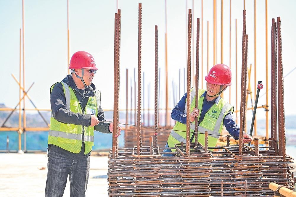 2月21日,平潭68海里皇冠假日酒店项目建设现场,技术人员正在测量钢筋尺寸,全力以赴冲刺节点目标。福建日报通讯员 林君斌 福建日报报业集团记者 张哲昊 摄