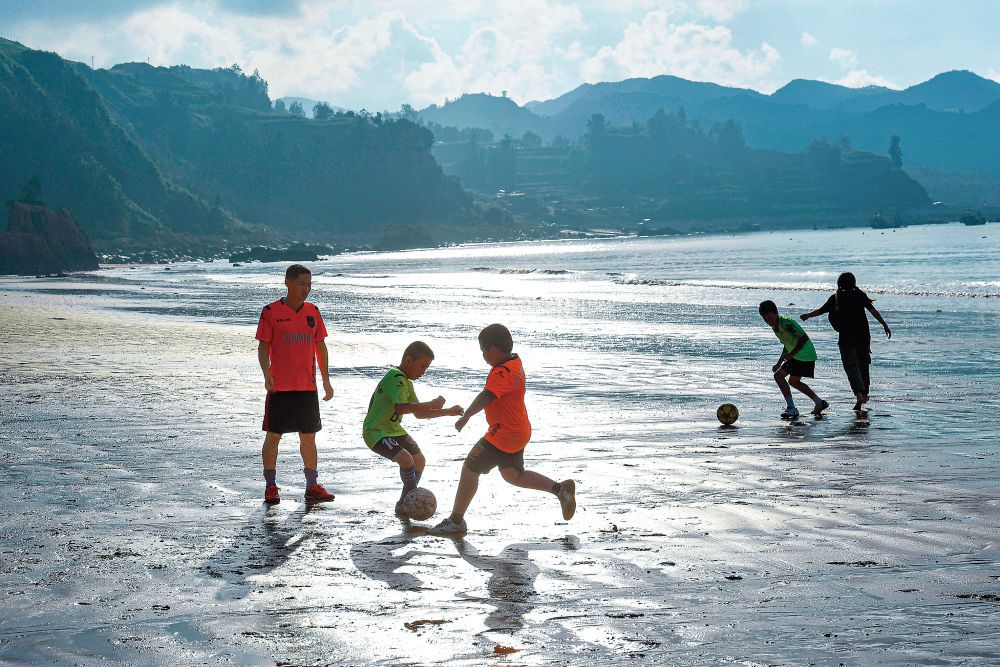 霞浦县下浒镇外浒沙滩上,“长风”足球队小球员们在海边踢球。新华社记者 姜克红 摄