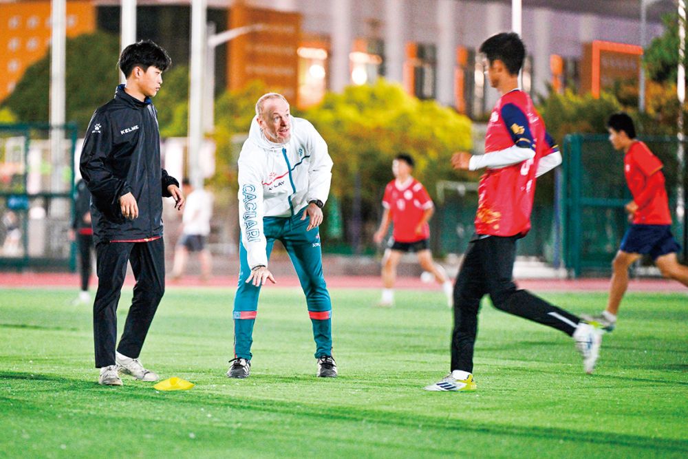 2025年10月29日,教练马科斯·卡普里奥洛(中)在指导霞浦一中高中男子足球队训练。新华社记者 姜克红 摄