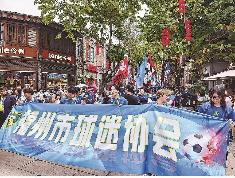 大赛在即,福州市球迷协会组织的“闽超”助威巡游从烟台山码头乘船沿江而下,徒步经过上下杭历史文化街区,又来到了三坊七巷。
