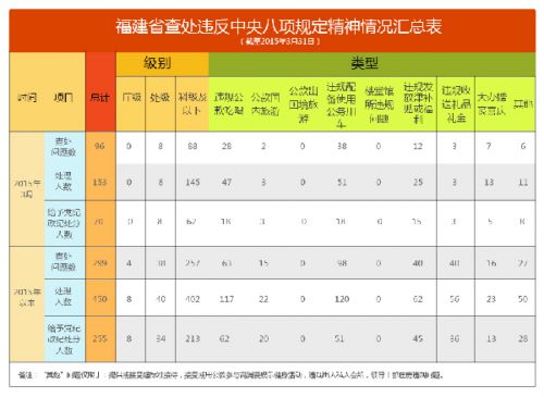 2015年3月,福建查处违反中央八项规定精神问题96件,给予党纪政纪处分70人。