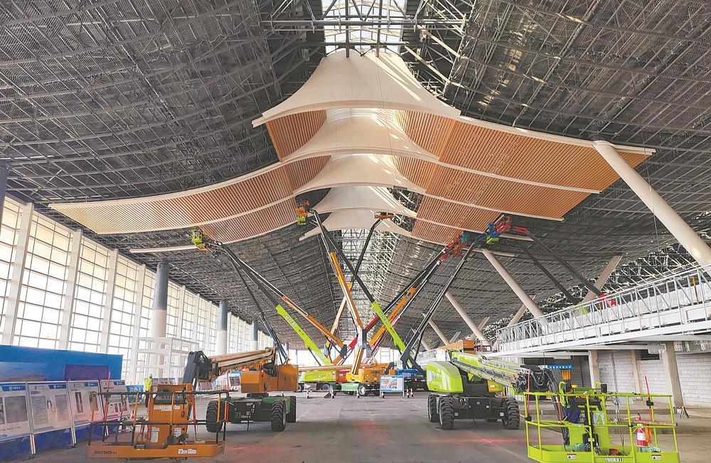 节日期间,福州长乐国际机场二期T2航站楼进入精装修阶段,约2500名建设者、140台各类机械冲刺关键节点。图为吊顶龙骨安装与墙面饰面板铺设施工现场。福建日报记者 张文奎通讯员 郑文元 摄