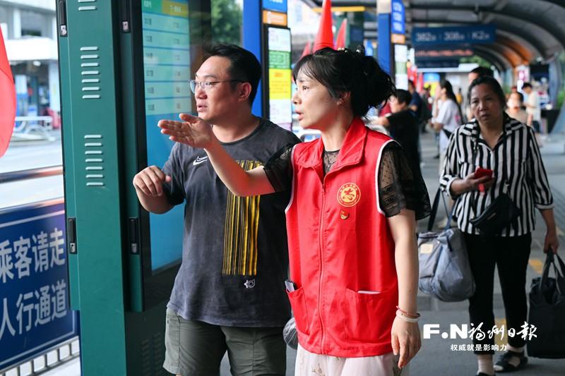 福州火车站北广场公交站工作人员为返乡旅客指引路线。记者 叶诚 摄