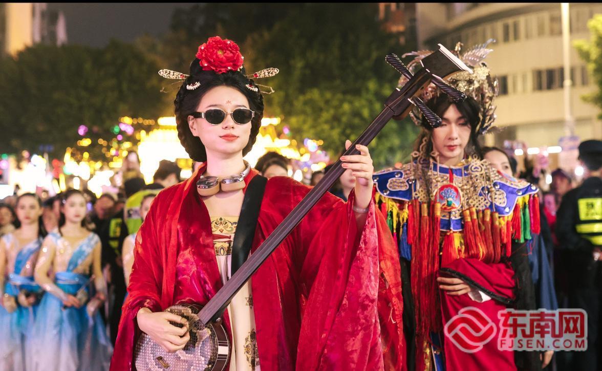 巡游中的00后抖音创作者@陈楚念是福州本地人,他在海外留学时将布袋木偶戏等传统戏剧与现代机械舞融合,单条视频收获超500万赞。作为非遗创新的代表,此次他身着融合簪花元素的服饰亮相千灯方阵,表现非遗风格机械舞,助古老非遗焕发新生。