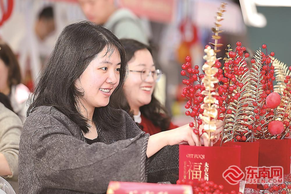 在“花福桶DIY”手作区,桌面上摆满了红冬青、金黄的银杏叶、寓意节节高的银柳以及各式各样的新春祝福挂饰。在花艺老师的指导下,榕台职工两人一组,创作属于自己的“新春福桶”(如图)。台青蔡佩纭手捧着刚插好的红福桶笑着说:“在台湾过年我们也喜欢买银柳和装饰品回家插,寓意‘银两’进门。今天这个福桶更特别,上面有‘福’字、有中国结,和福州同事一起做,感觉就像一家人围在一起装点自己的家,特别暖心。”