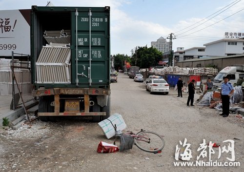 肇事的集装箱内,装有大量瓷砖,这些瓷砖属于路边新年代瓷砖仓库的。店内一名员工说,当时,集装箱的门并未上锁,事故发生后,他们才把集装箱靠近路面一侧的门给锁上。