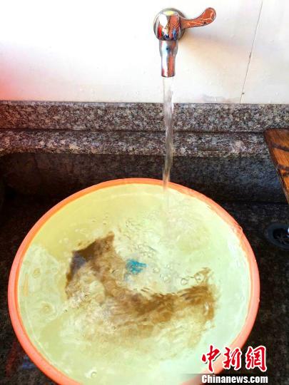 然而,自来水含沙的情况,依然没有好转。当天,中新网记者来到蔡先生的家中。在蔡先生家中的一处洗脸槽,记者打开水龙头蓄水一会,便见到水槽底部沉淀着不少沙子;即使放水许久后,仍有不少沙子陆陆续续流出。
