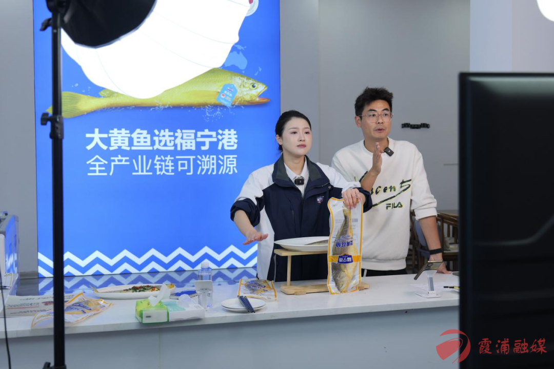 在霞浦县电商公共服务中心,多家电商主播通过线上直播,向全国消费者推介大黄鱼产品。图源:霞浦融媒