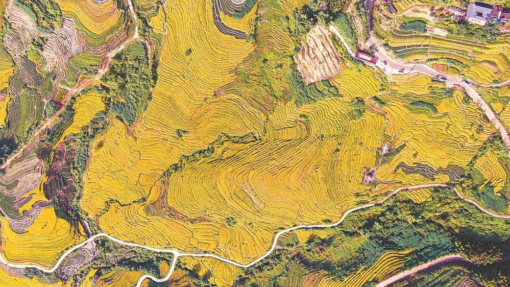 16日,华安县湖林乡石井村千亩梯田披“金甲”。 林国桦 唐小玲 摄