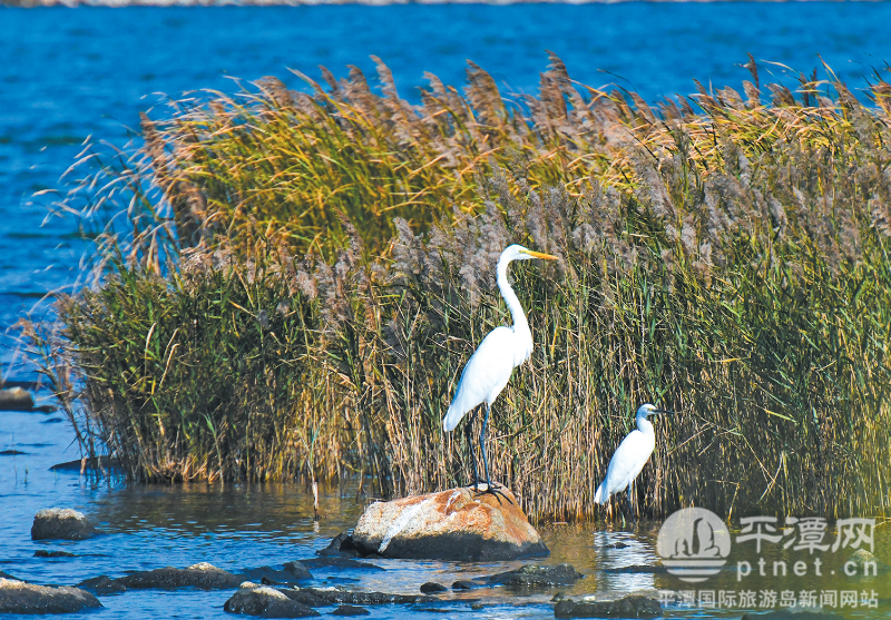 在如意湖公园,白鹭在湖边栖息。