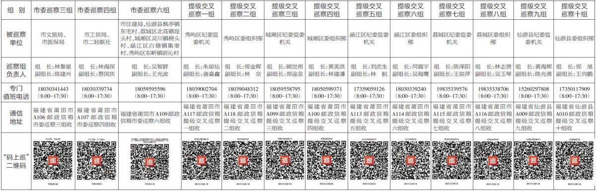 根据党中央关于巡视巡察决策部署及省委、市委工作要求,经市委巡察工作领导小组研究决定,从11月中旬开始,市委巡察组对市文旅局、市医保局、市工信局、市二轻联社、市住建局等党组织开展巡察“回头看”;对县(区)纪委监委机关、党委组织部门开展提级交叉巡察;对仙游县枫亭镇东宅村、荔城区北高镇埕头村、城厢区灵川镇榜头村、涵江区白塘镇集奎村、秀屿区东峤镇前沁村等5个村党组织提级开展巡察“回头看”。巡察“回头看”时间20天左右,提级交叉巡察时间30天左右。日前,巡察组已进驻巡察。