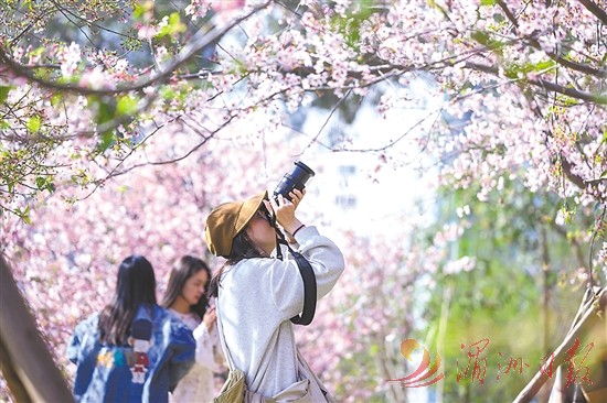 市民游客在樱花树下打卡拍照。