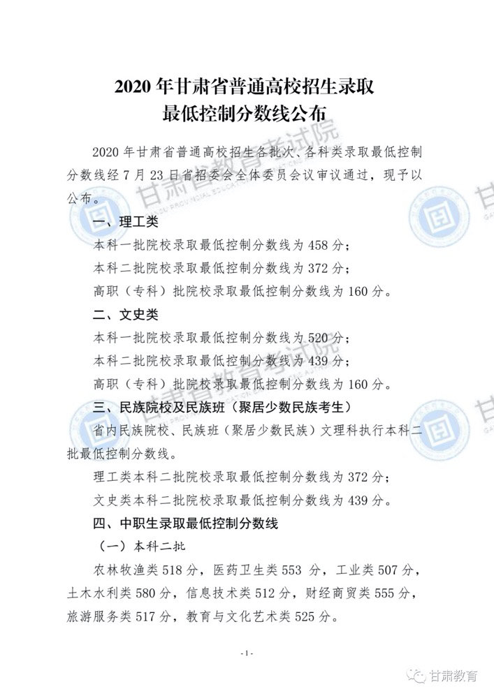 【2020年甘肃省普通高校招生招生录取最低控制分数线公布:一本文科520,理科458】甘肃省2020年普通高校招生录取最低控制分数线确定。本科一批:理工类为458分,文史类为520分;本科二批:理工类为372分,文史类为439分。