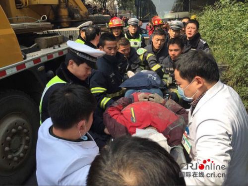 吊机将公交车吊起后将男子拉出车底后送往医院。
