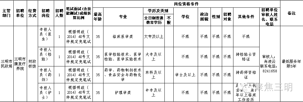 2016年三明市康复疗养院公开招聘紧缺急需专业工作人员岗位信息表