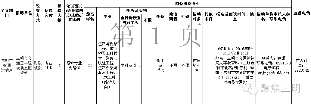 2016年三明市交通基本建设质量监督站公开招聘紧缺急需专业工作人员岗位信息表