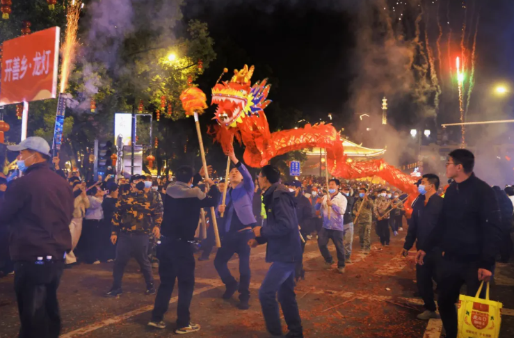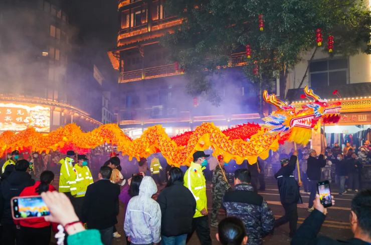 梅口龙灯又称“耍龙灯”,舞龙者随绣球引动,将扭、挥、仰、跪、跳、摇等经典动作演绎得淋漓尽致,龙身辗转腾挪、流光溢彩,在夜色中宛若星河游龙,尽显传统舞龙的灵动之美。