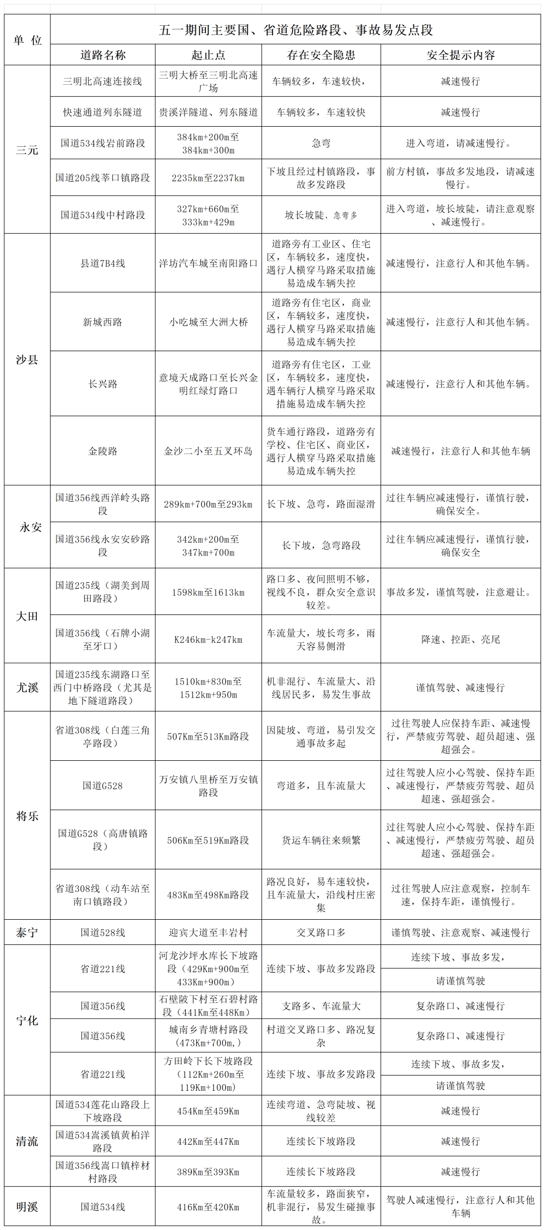 “五一”期间主要国、省道危险路段、事故易发点段