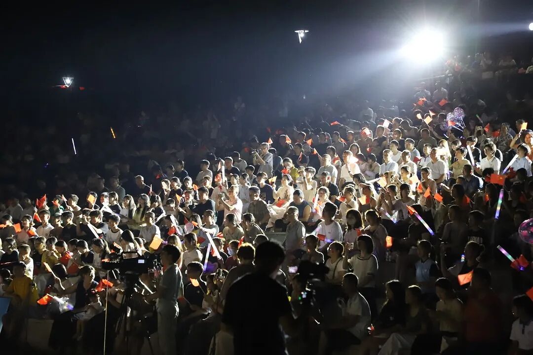 当晚的最高潮出现在20时25分的主题仪式“新中国成立76周年庆典时刻”,代表新中国走过了1949—2025波澜壮阔的76周年。当主持人宣布这一庄严时刻到来时,全场目光聚焦舞台,由探甲·南天乐队带来的大合唱《红旗飘飘》《歌唱祖国》响彻夜空,雄壮激昂的旋律一响起,烟花礼炮同时绽放的瞬间,引发了全场观众的强烈共鸣,现场观众自发挥舞起手中的五星红旗,顷刻间,会场瞬时化为一片壮丽的“红色海洋”,将爱国热情推向顶峰。