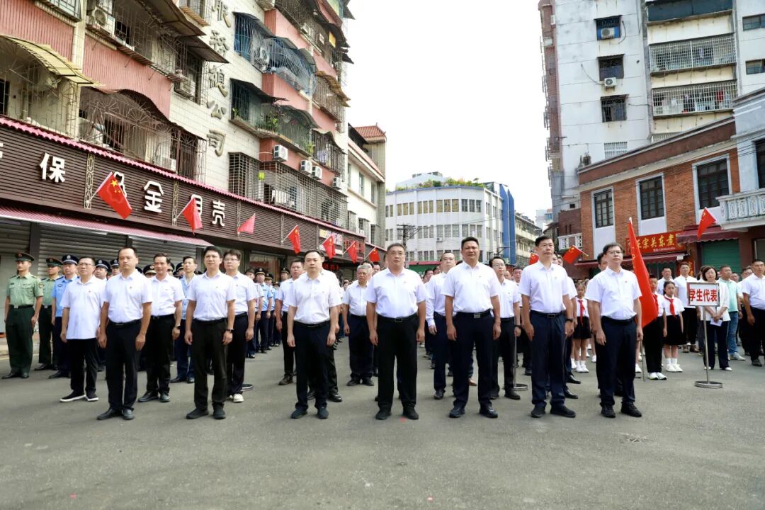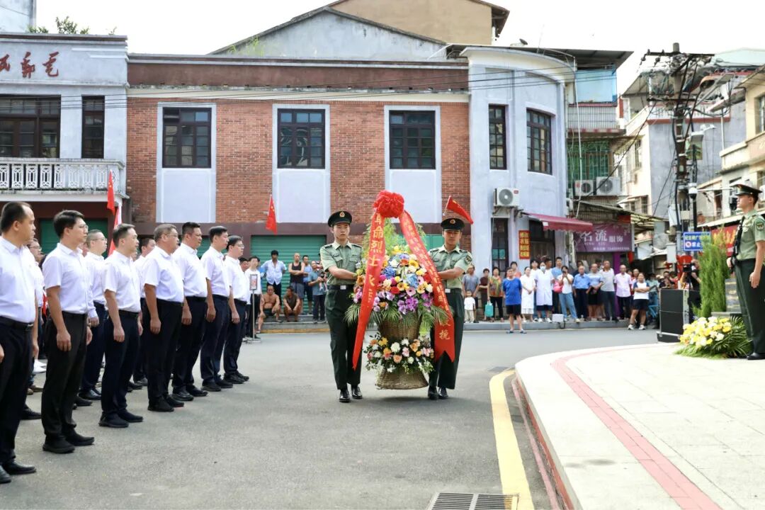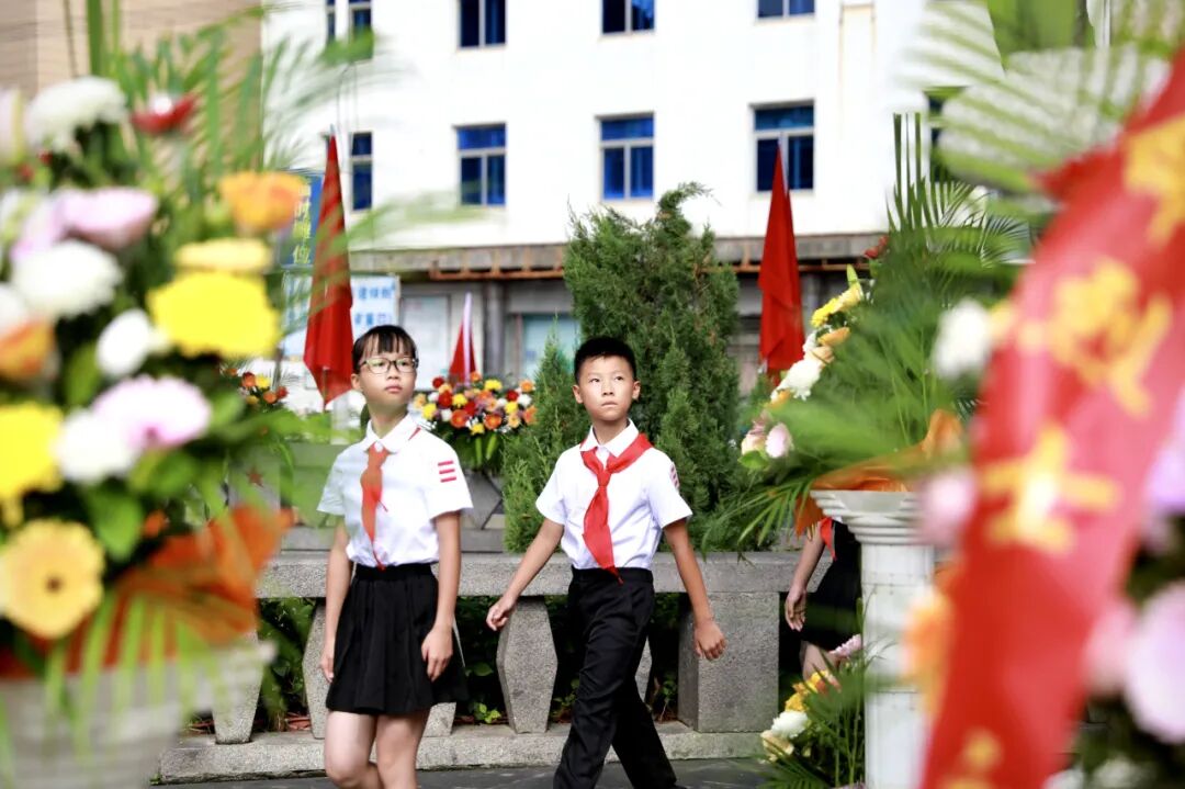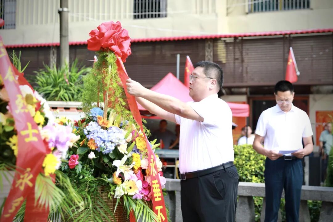 默哀毕,60名少先队员献唱《我们是共产主义接班人》。伴随着《献花曲》,区党工委书记谢宏坤缓步上前,仔细整理花篮缎带,缎带上“革命烈士永垂不朽”的金色大字,在阳光下熠熠生辉,承载着全区人民对先烈的深切敬意。